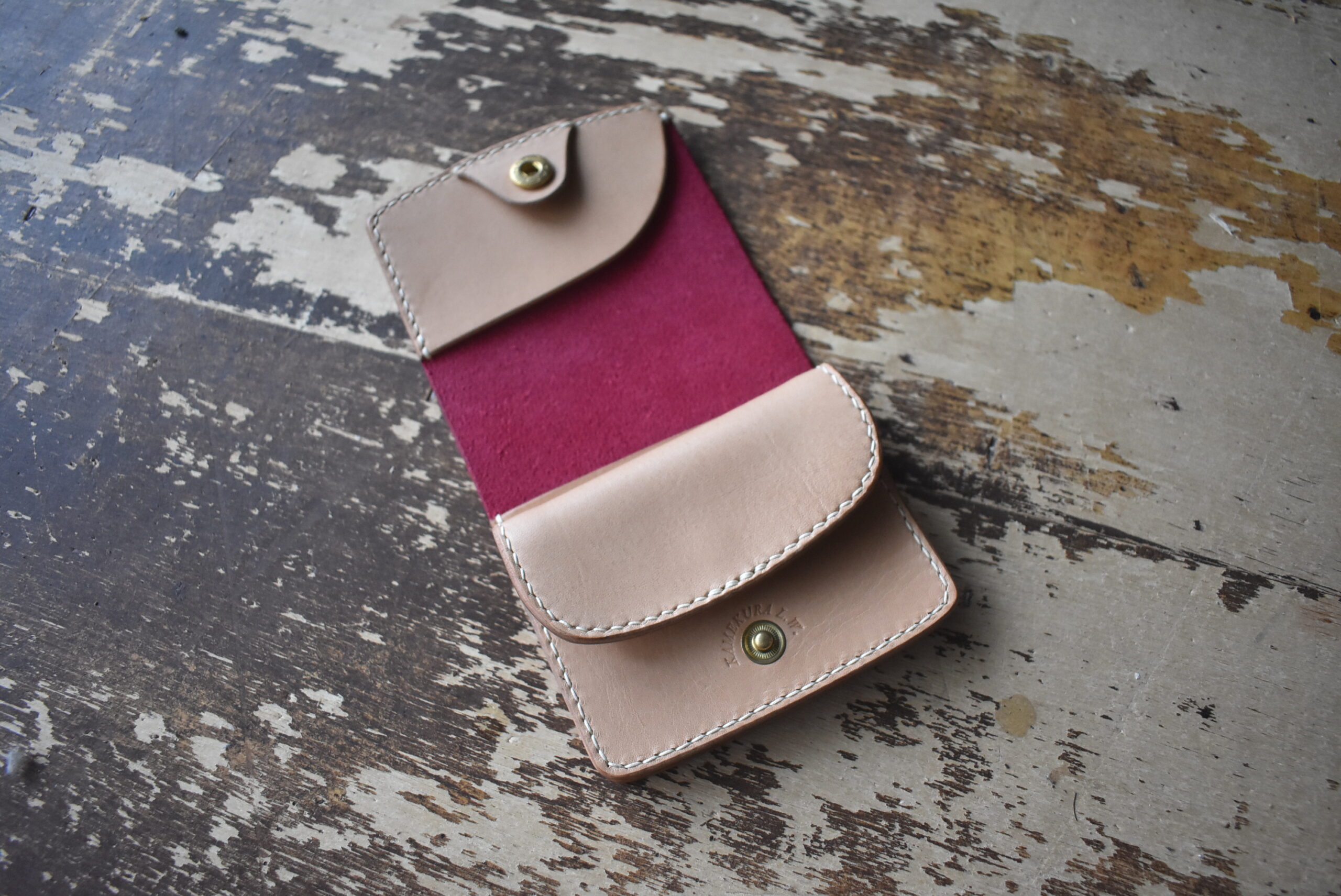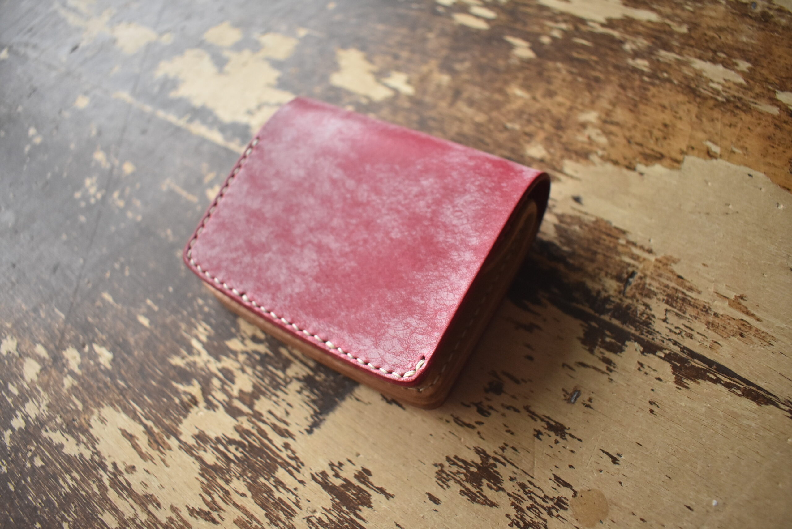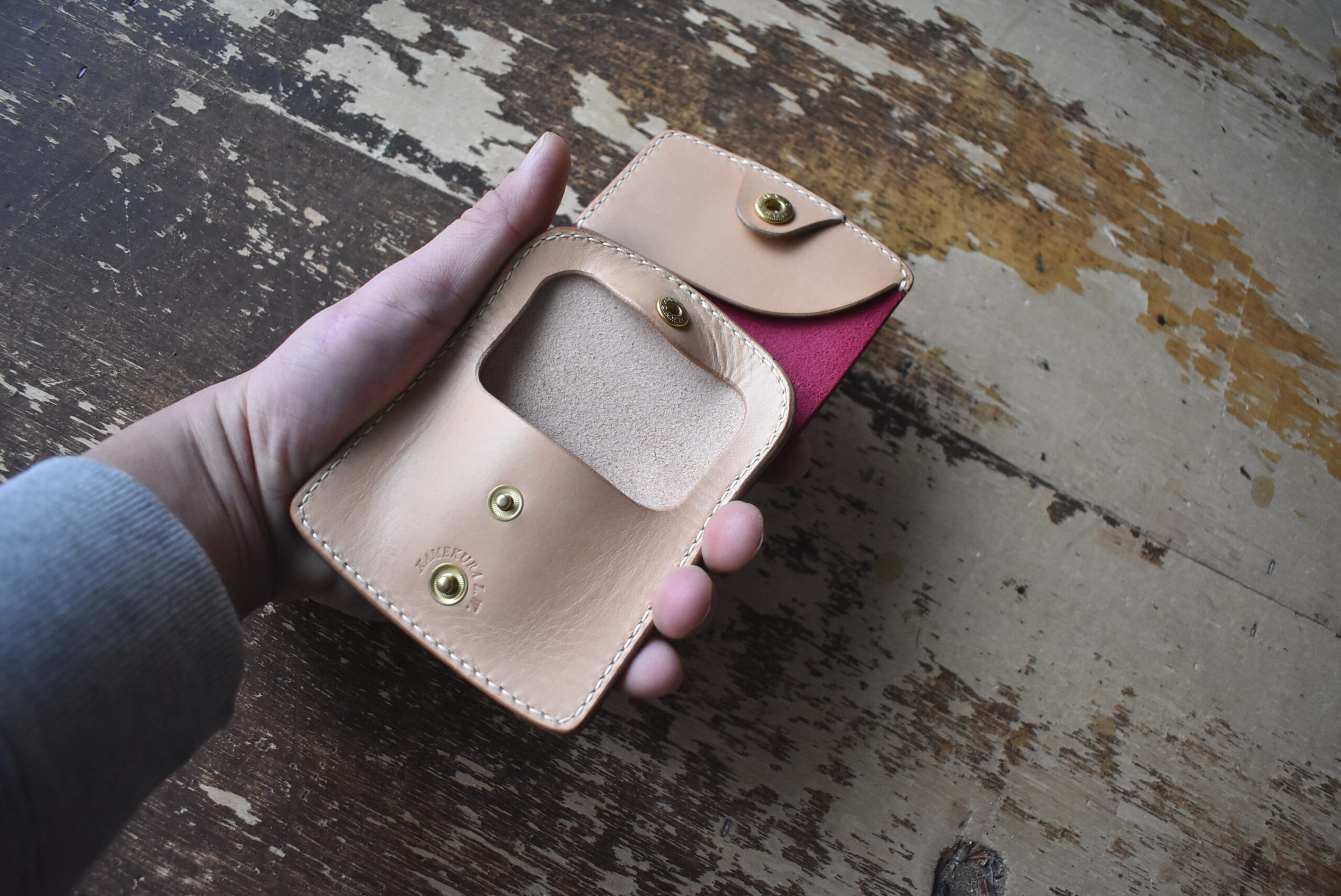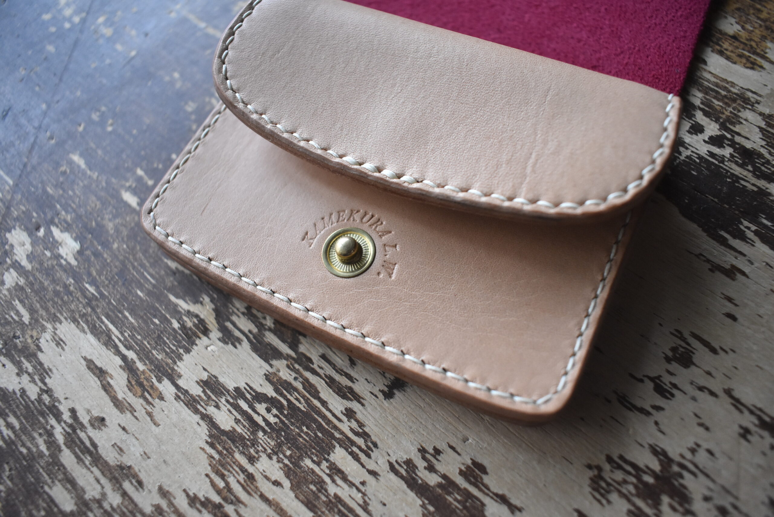 スクラッチ加工、ワックスコーティングされている発色の良いピンクの革を外装に使い