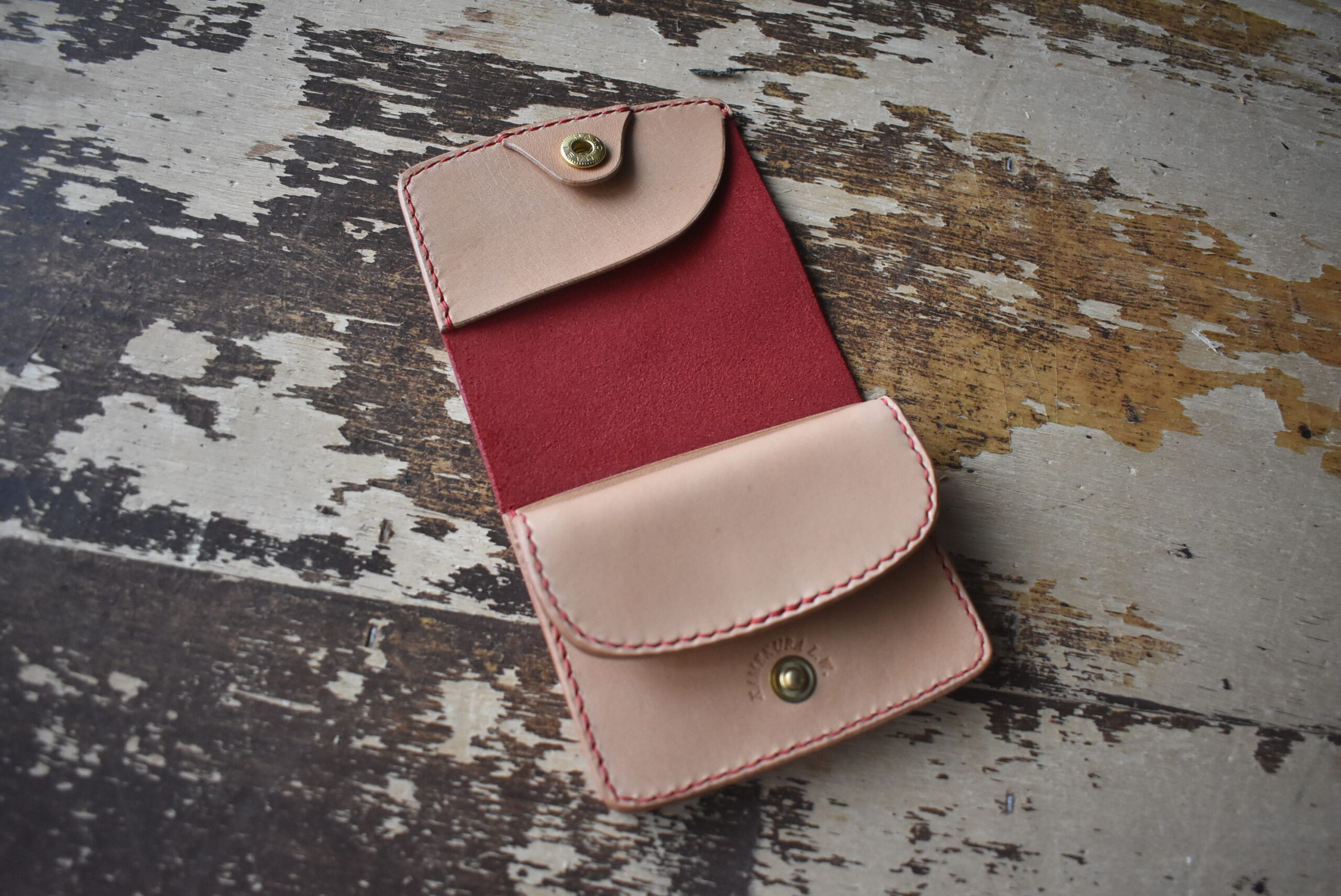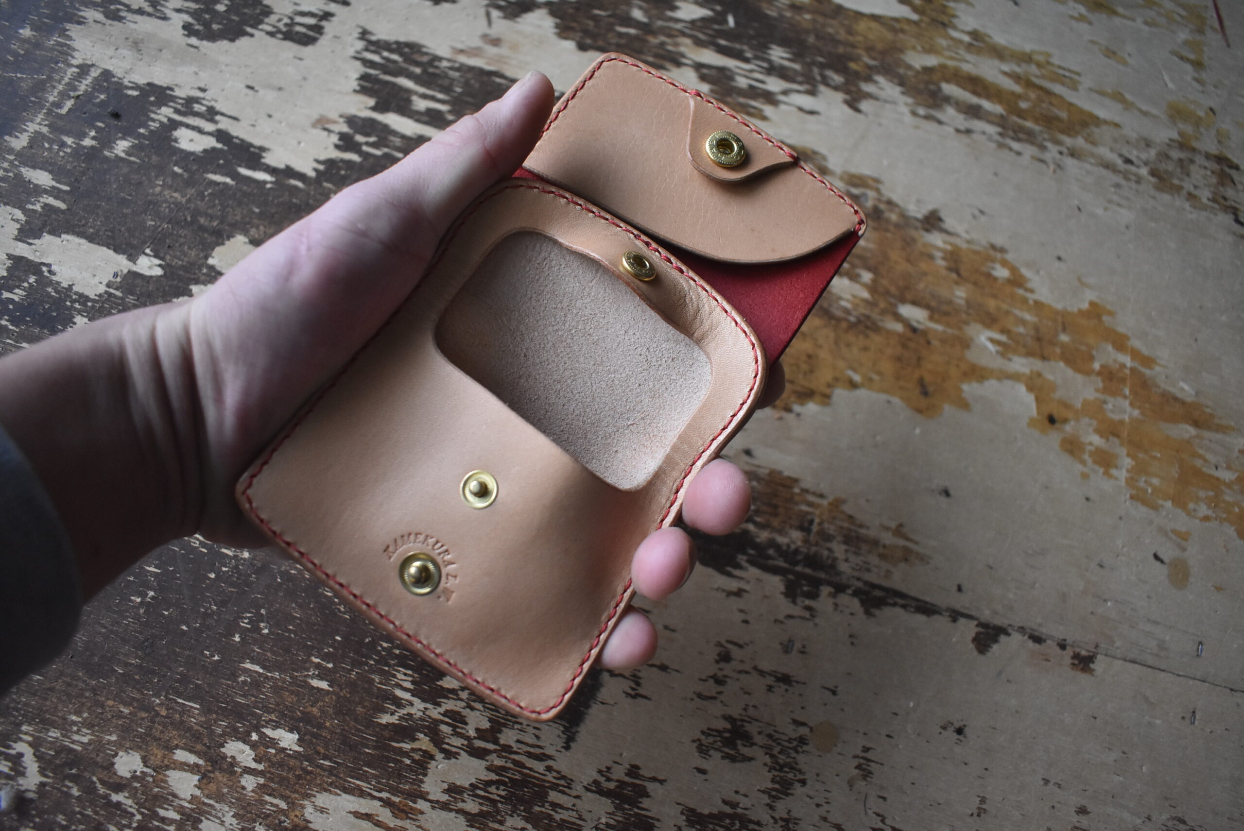 ヘアライン加工されている発色の良いレッドの革を外装に使い